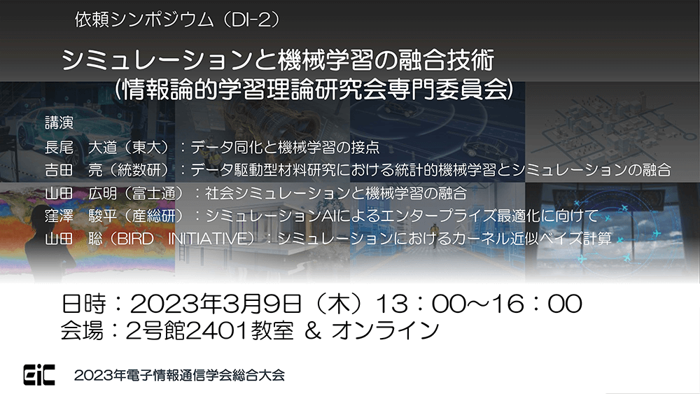 We will co-host the invited symposium 「DI-2 Fusion Technology of Simulation and Machine Learning」 at the 2023 IEICE General Conference.