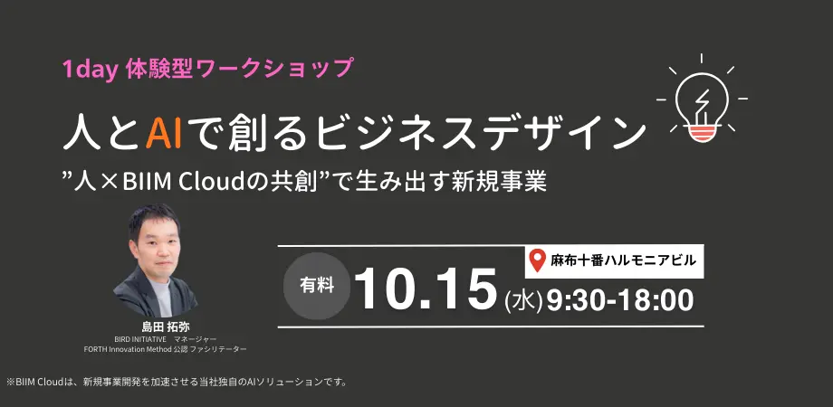 In this workshop, we will introduce innovation methods that are being practiced by major companies around the world.「FORTH Innovation Method」Based on this, you can experience part of the process of creating new business ideas using AI. Our unique AI solution that accelerates new business development「BIIM Cloud for Business」By actually operating the system, participants will organize and deepen the ideas that have been generated through co-creation between AI and humans, and create concepts for new businesses.