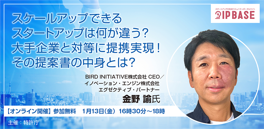 弊社BIRD INITIATIVE 金野CEOが、特許庁主催、ASCII STARTUP協力で開催されるオンラインセミナー「スケールアップできるスタートアップは何が違う?大手企業と対等に提携実現!その提案書の中身とは?」に登壇します。